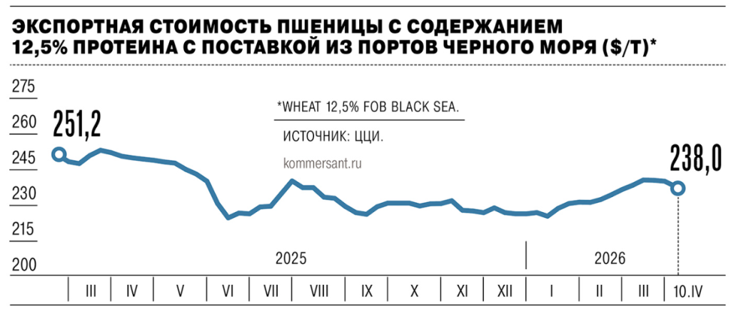 Средняя экспортная стоимость пшеницы с поставкой из портов Черного моря на 10 апреля 2026 года составила $238 за тонну, сократившись на 0,8% за неделю и на 5,2% год к году, подсчитали в Центре ценовых индексов (ЦЦИ). Значение, как следует из данных аналитиков, фактически вернулось к показателю первой половины марта. В «Совэконе» отмечают, что стоимость российской пшеницы на мировых рынках за неделю потеряла $1, составив $237–239 за тонну.