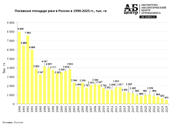 Так, в 2024 году сборы ржи в РФ упали до минимальных за всю историю значений и составили менее 1,2 млн тонн (к 2023 году они сократились более чем на 30%).