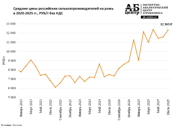 Как сообщается в очередном еженедельном обзоре рынка зерна от АБ-Центр, цены на рожь за год (в июле 2025 года к июлю 2024 года) выросли на 64,6%. По данным Росстата они составили 12 303 РУБ/т без НДС.