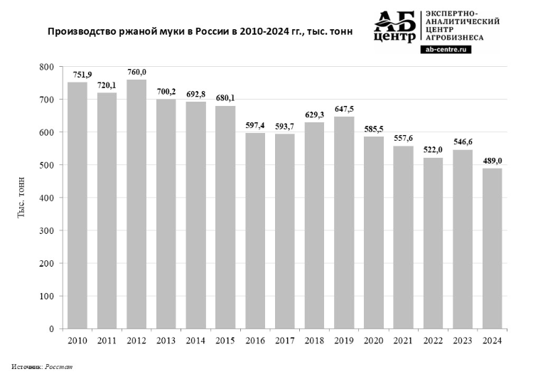 Падение спроса на продовольственную рожь во многом связано со снижением потребности в ржаной муке. По итогам 2024 года производство данного вида муки в стране составило 489,0 тыс. тонн. Это на 10,5% меньше, чем в 2023 году.