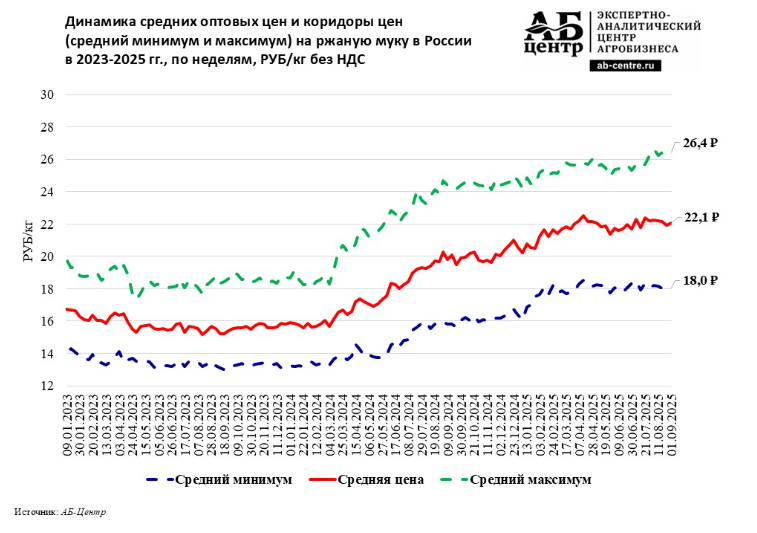 По данным Росстата, средние отпускные цены производителей на ржаную муку в июле 2025 года составили 20 121 РУБ/кг без НДС, что на 18,6% выше уровня цен годичной давности и на 41,8% превышает значения двухлетней давности.