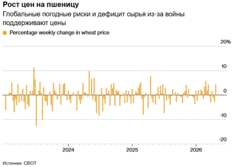 Пшеница демонстрирует значительный недельный рост, почти максимальный за два месяца. Это произошло на фоне сохраняющихся опасений относительно погодных условий и сокращения поставок удобрений из-за конфликта в Иране. Данные факторы усилили беспокойство относительно будущего урожая, пишет Bloomberg.